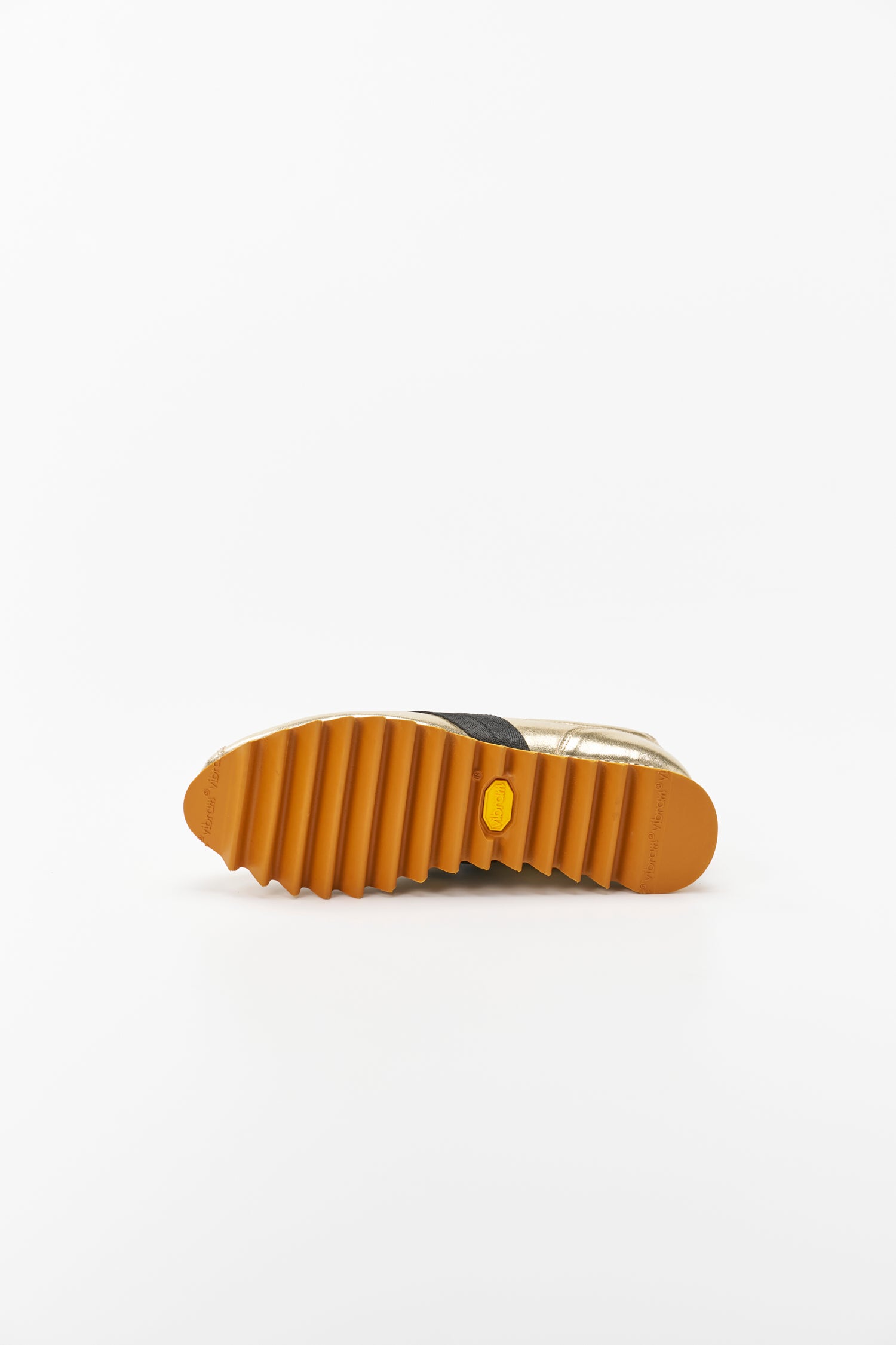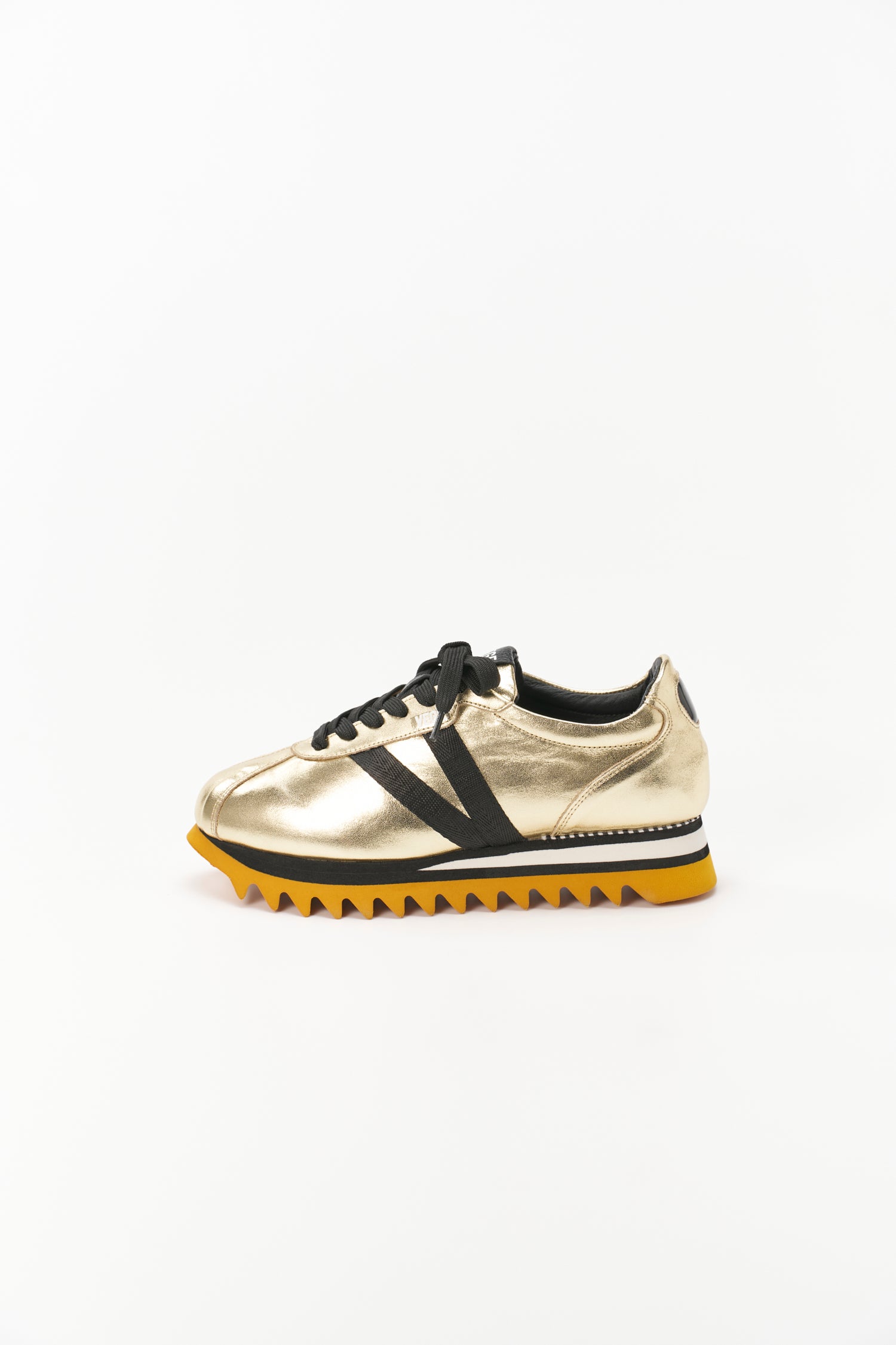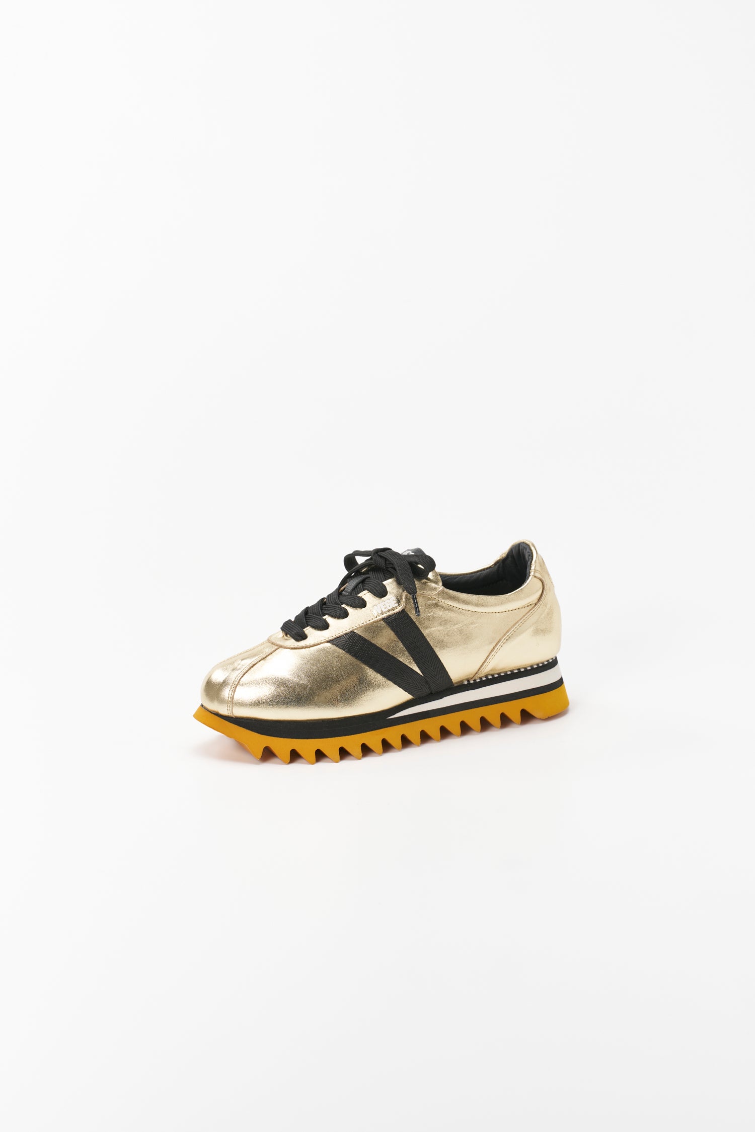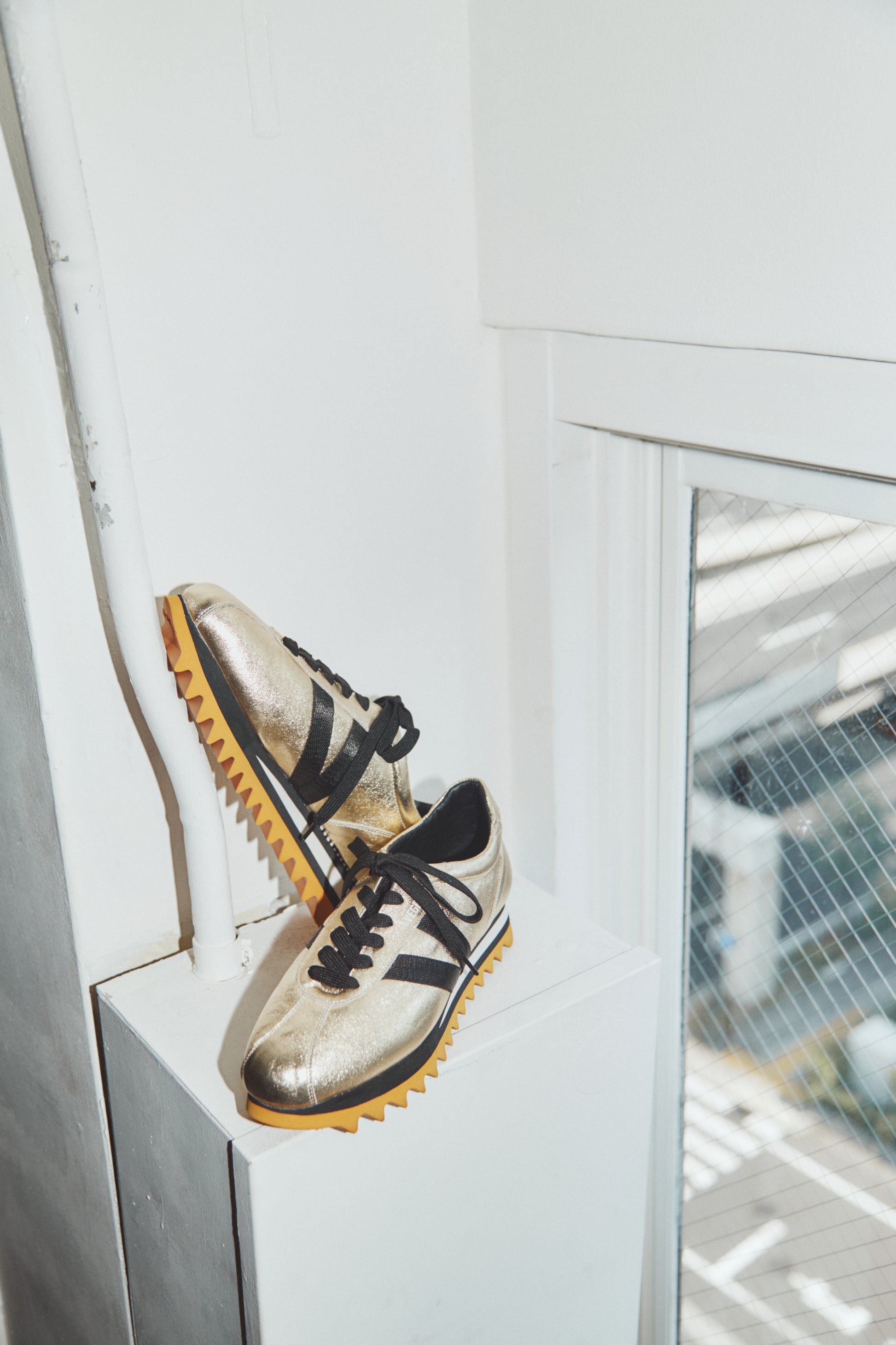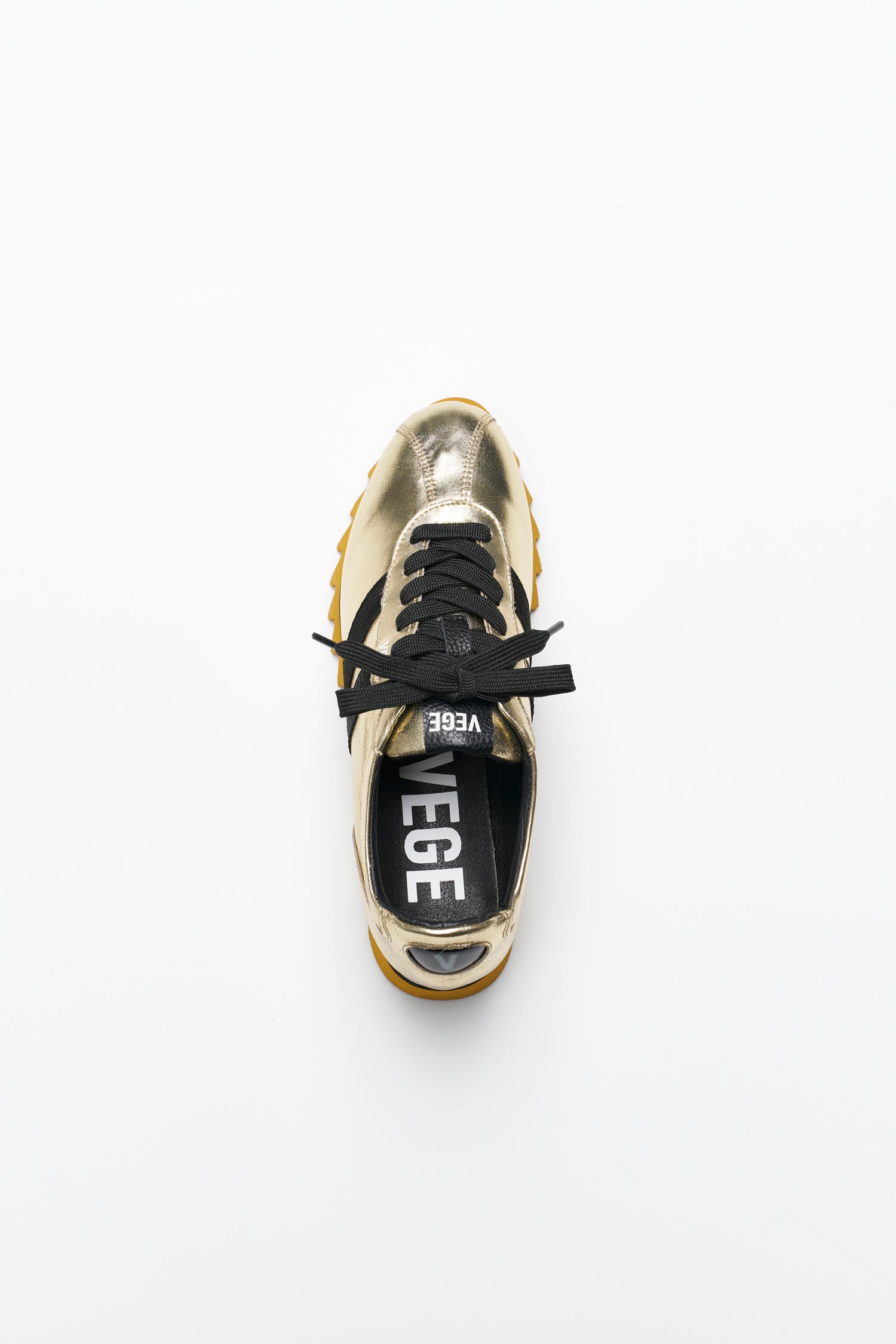 艶やかなゴールドのレザーに、ガムソールのようなマスタードイエローがVEGEらしい“クセ”を効かせた一足。