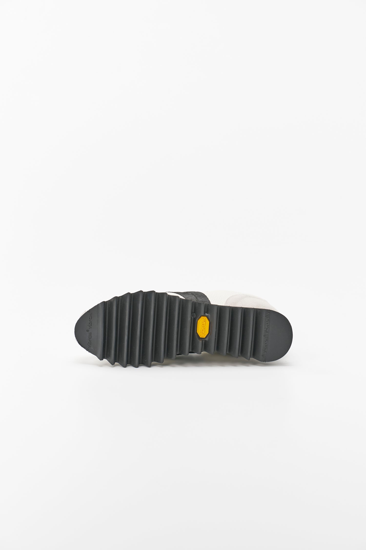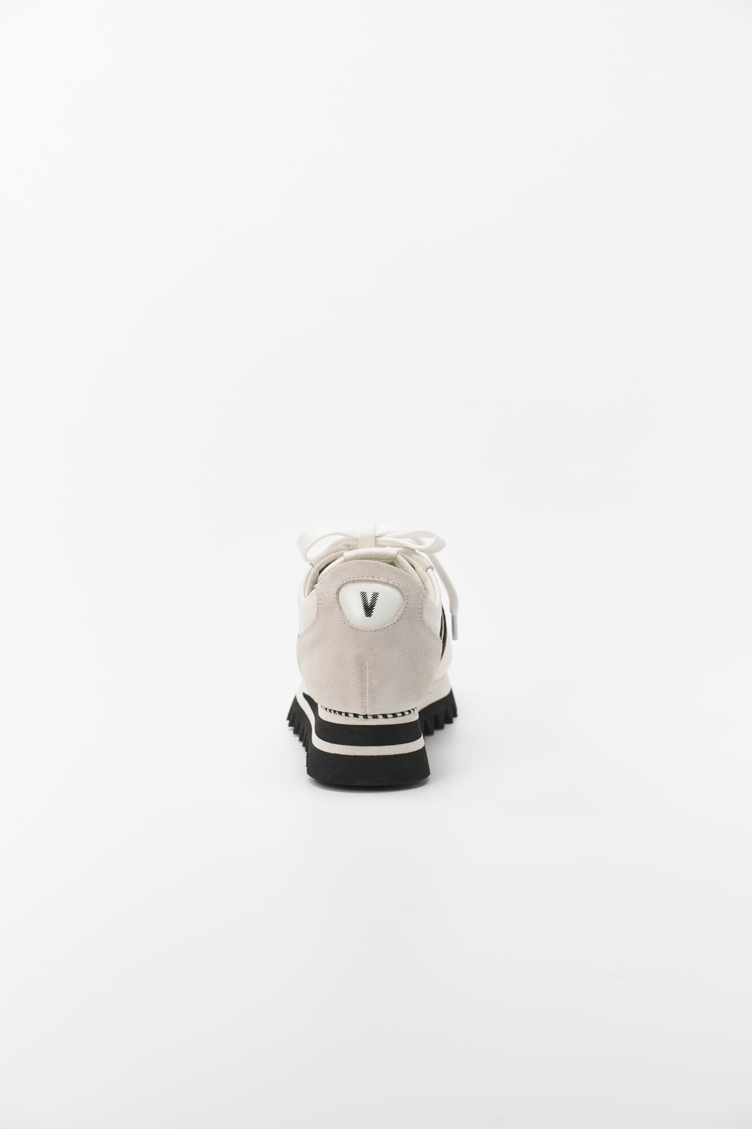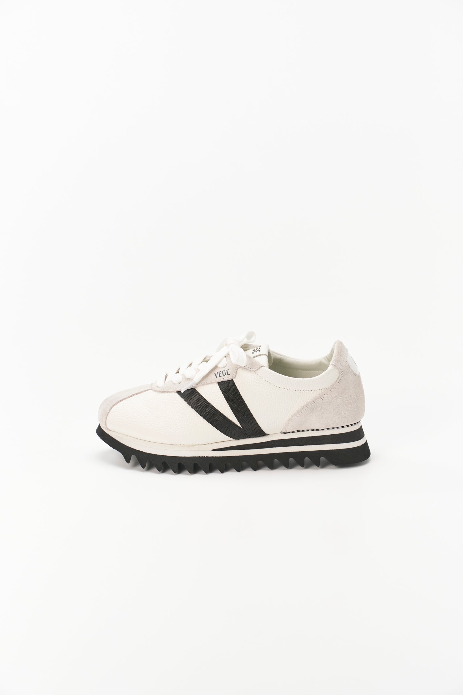 柔らかなホワイトにブラックのVテープが映える、潔くて洗練された一足。