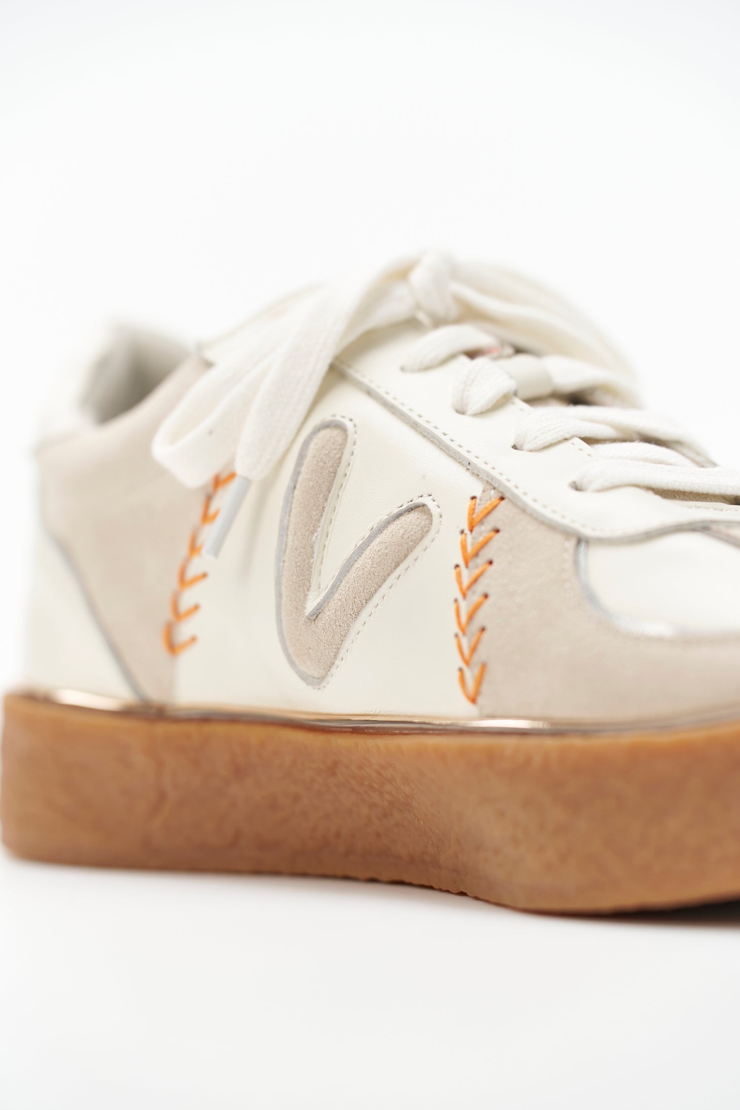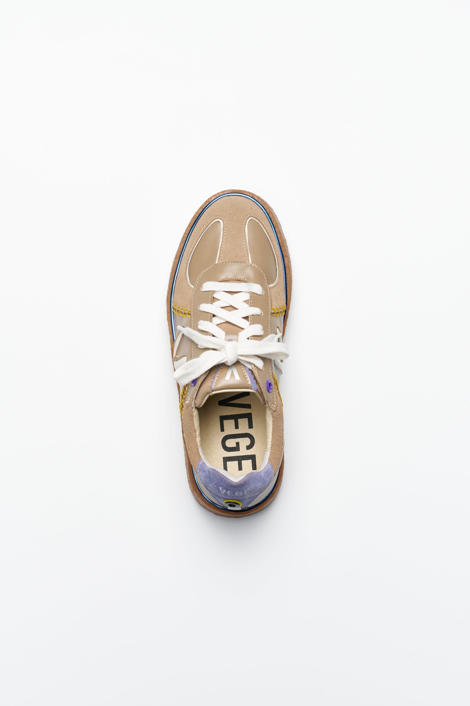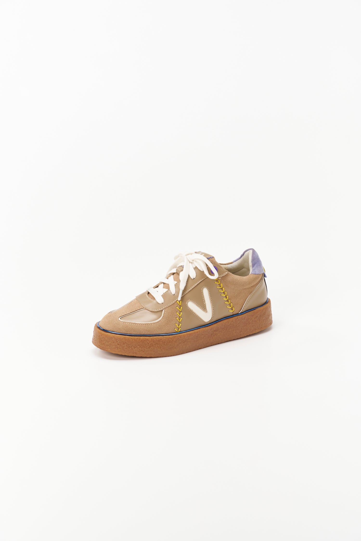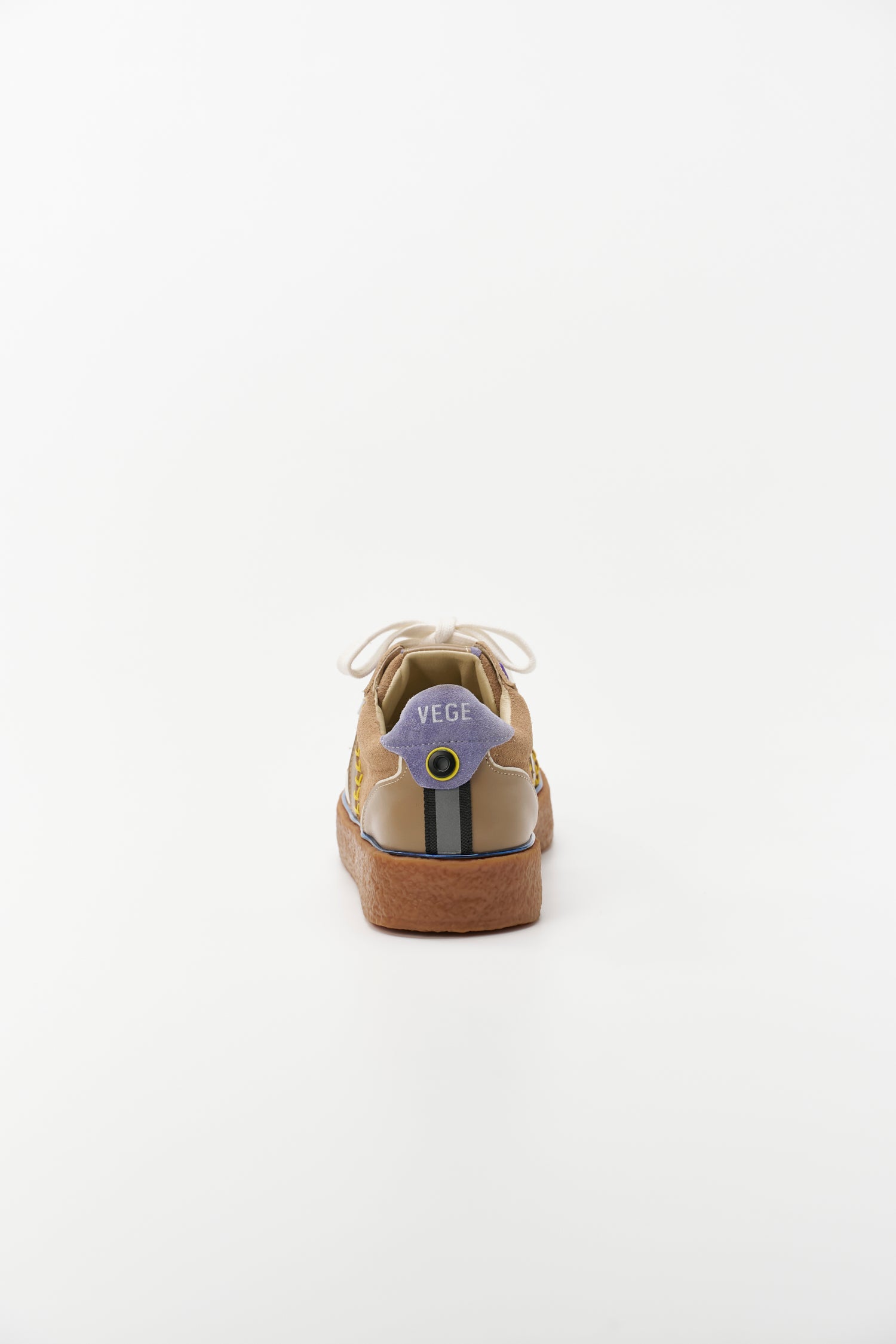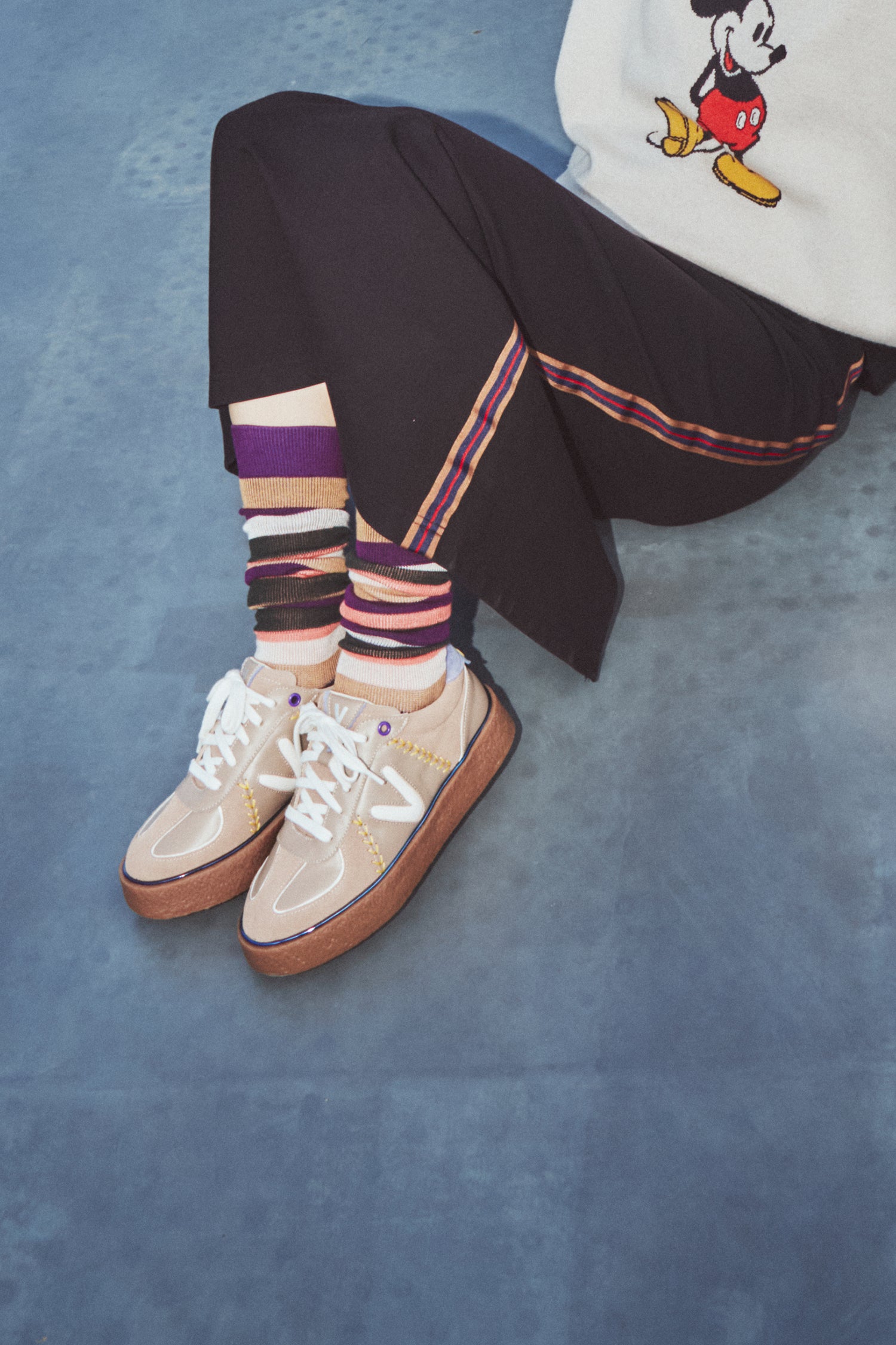 ややくすみ感のあるベージュにイエローのステッチ、ラベンダーのかかとが◎