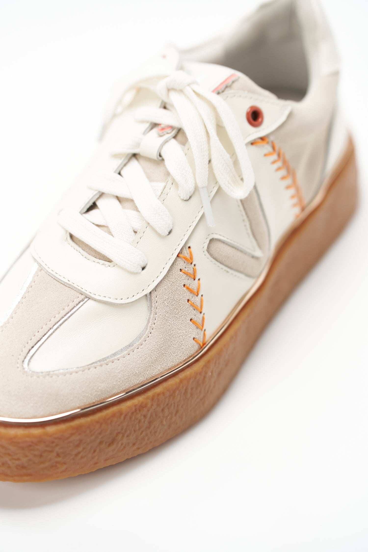 やわらかなニュアンスホワイトに、キャメル系ステッチが効いた明るめカラー。